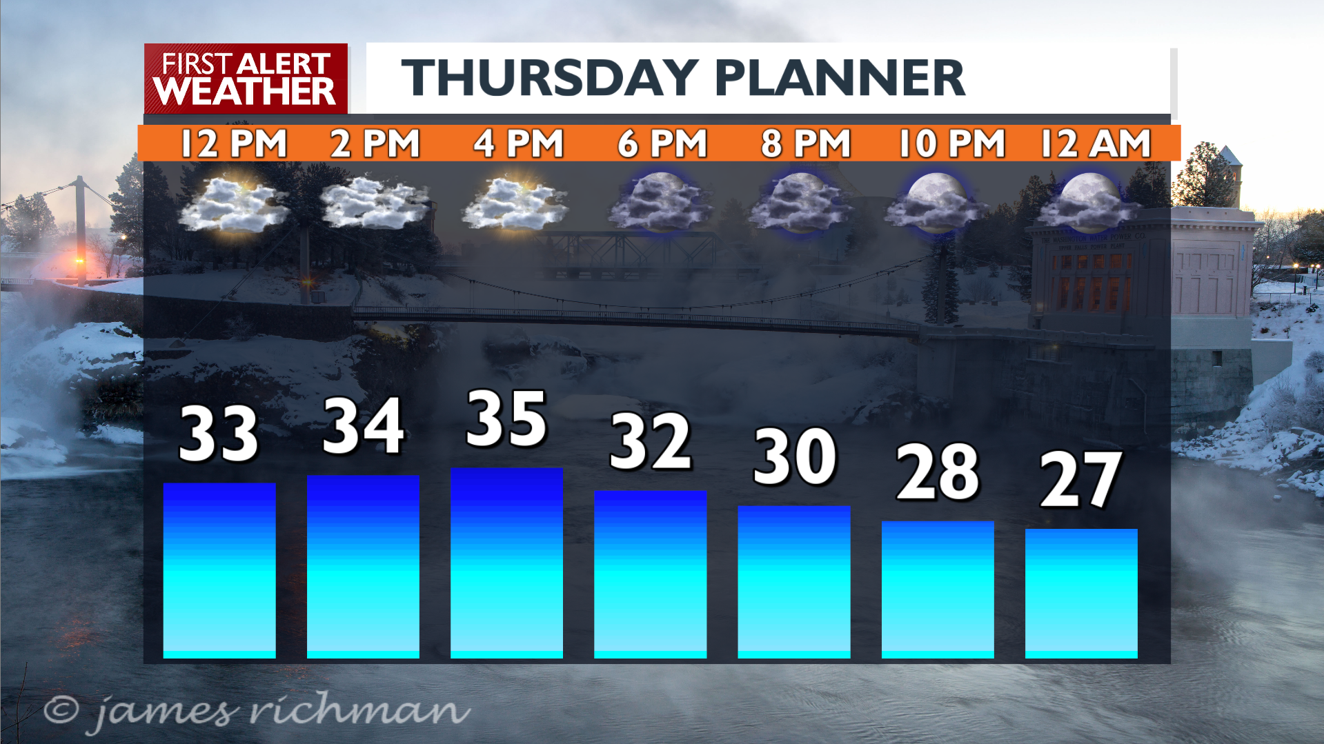 Clouds and fog today with a high of 35. Cloudy and fog Friday morning warming to 31. Mid 20s for the weekend and Monday with teens overnight.