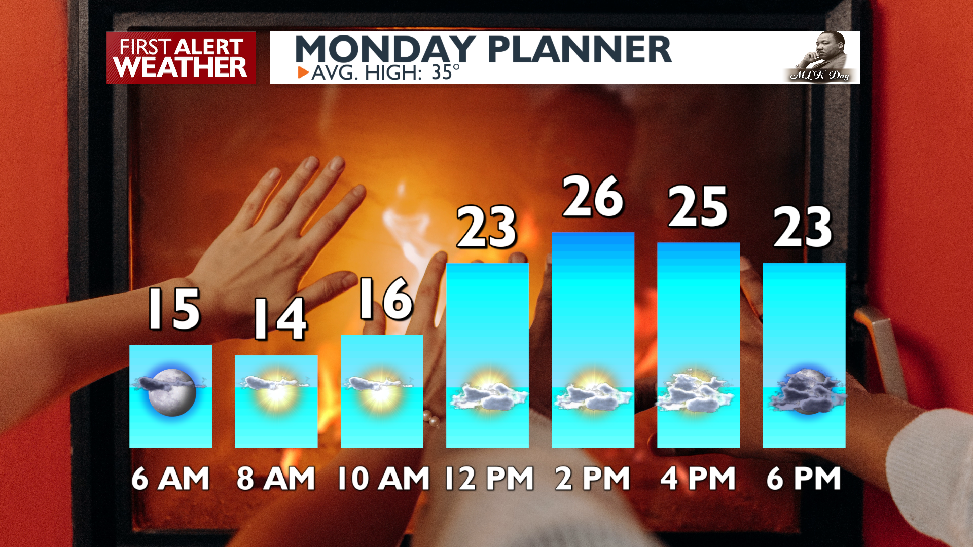 Coldest temperatures of the winter Monday morningMartin Luther King Day: Sunshine and fog, then partly cloudy with highs in the mid-20sCloudy and warmer on TuesdaySnow showers Thursday night and Friday morningAnother cold but sunny weekend with lows in the teens