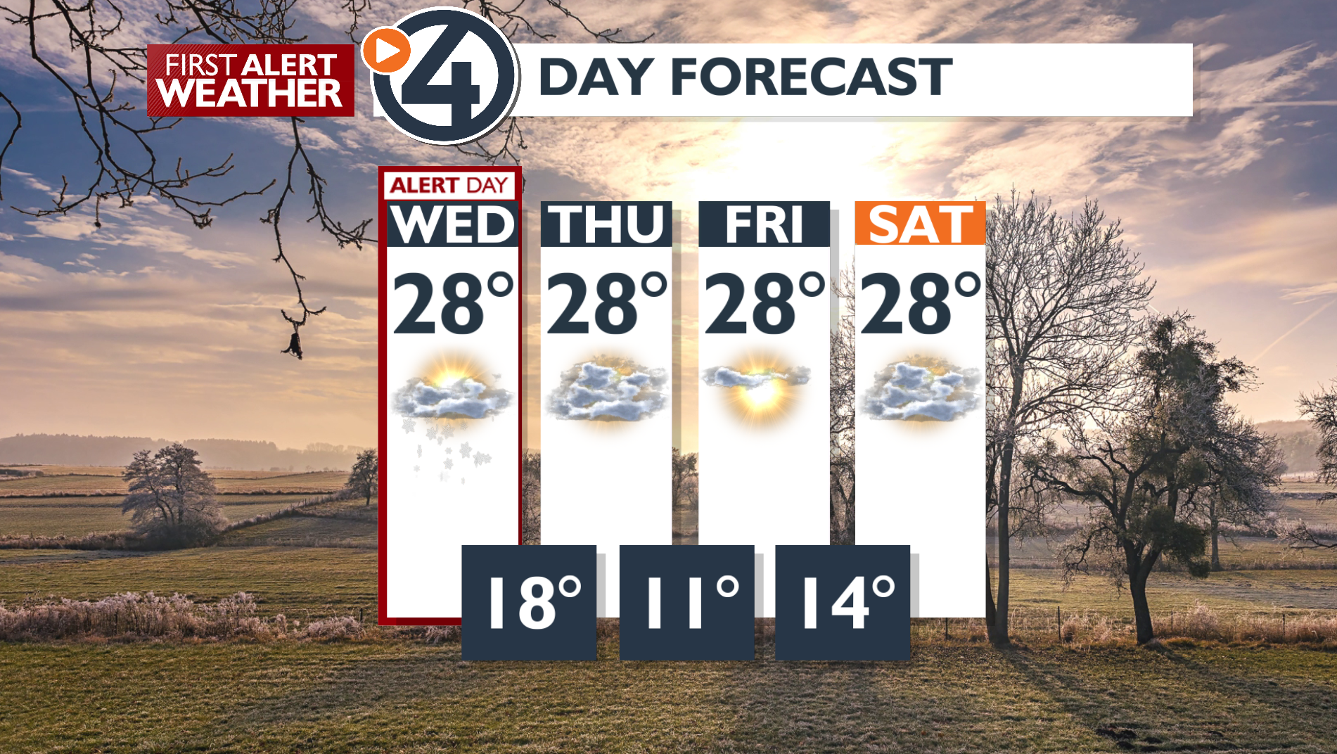 Weather Alert Day for the morning commute with fresh snow. Light snow flurries and cold today, 28.