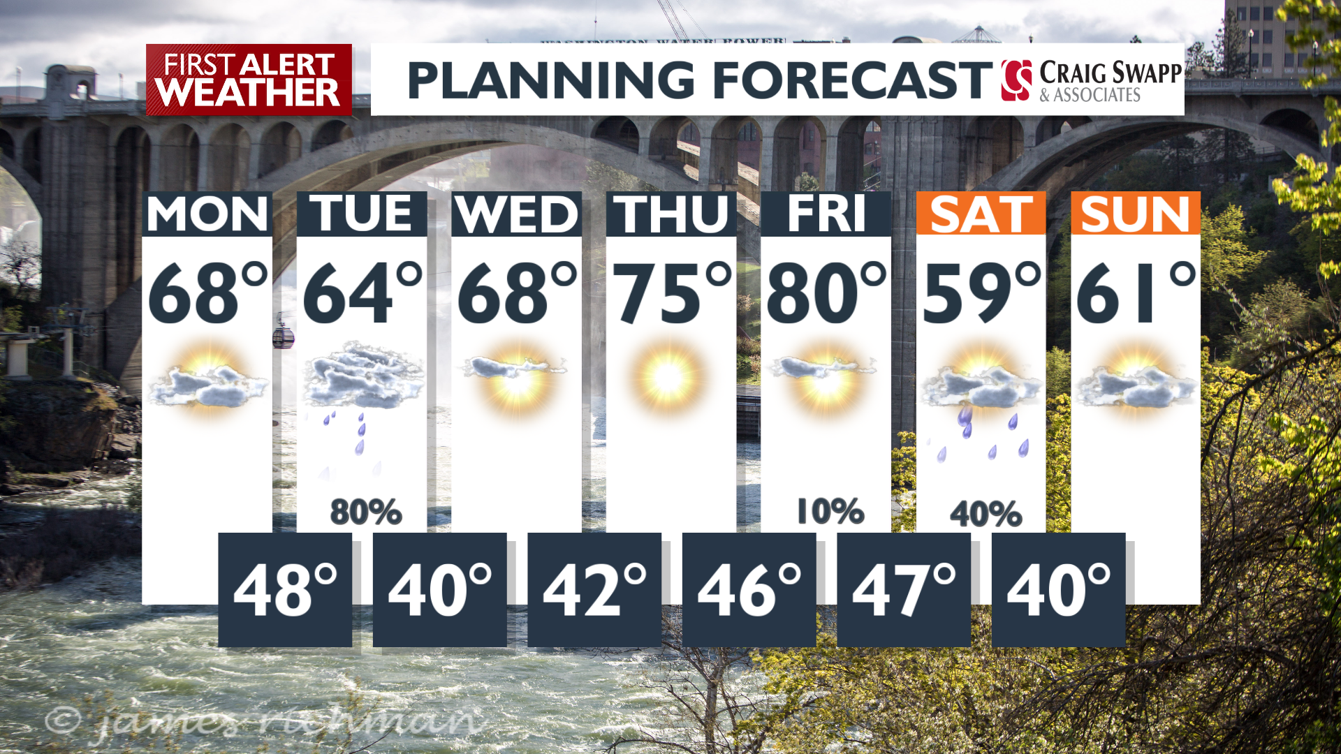 After a spectacular weekend, we are looking just a bit cooler for your Monday with highs in the upper 60’s for most of the Spokane area. We are still well above our average temperatures and will be for your work week.