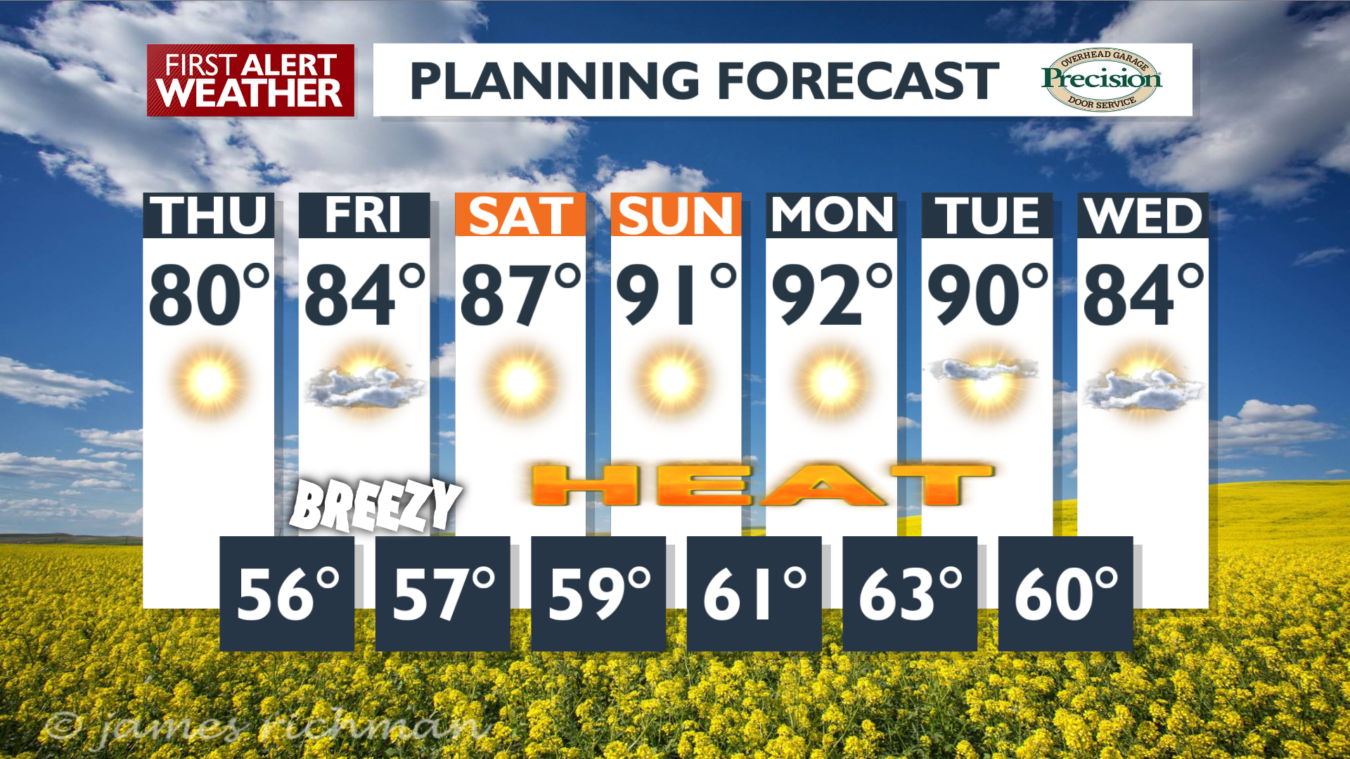 Sunny and low 80s ThursdayStarting cloudy Friday as dry front passes through; breezy afternoonUpper 80s-low 90s Saturday, low-mid 90s SundaySunday should be the hottest day of 2025 so farEarly summer heat lasts through at least next Tuesday
