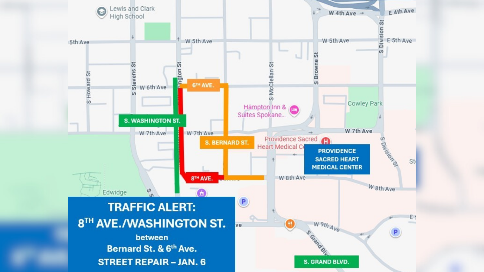 SPOKANE, Wash. — Part of 8th Avenue and Washington Street in Spokane will be closed on Tuesday for paving work.