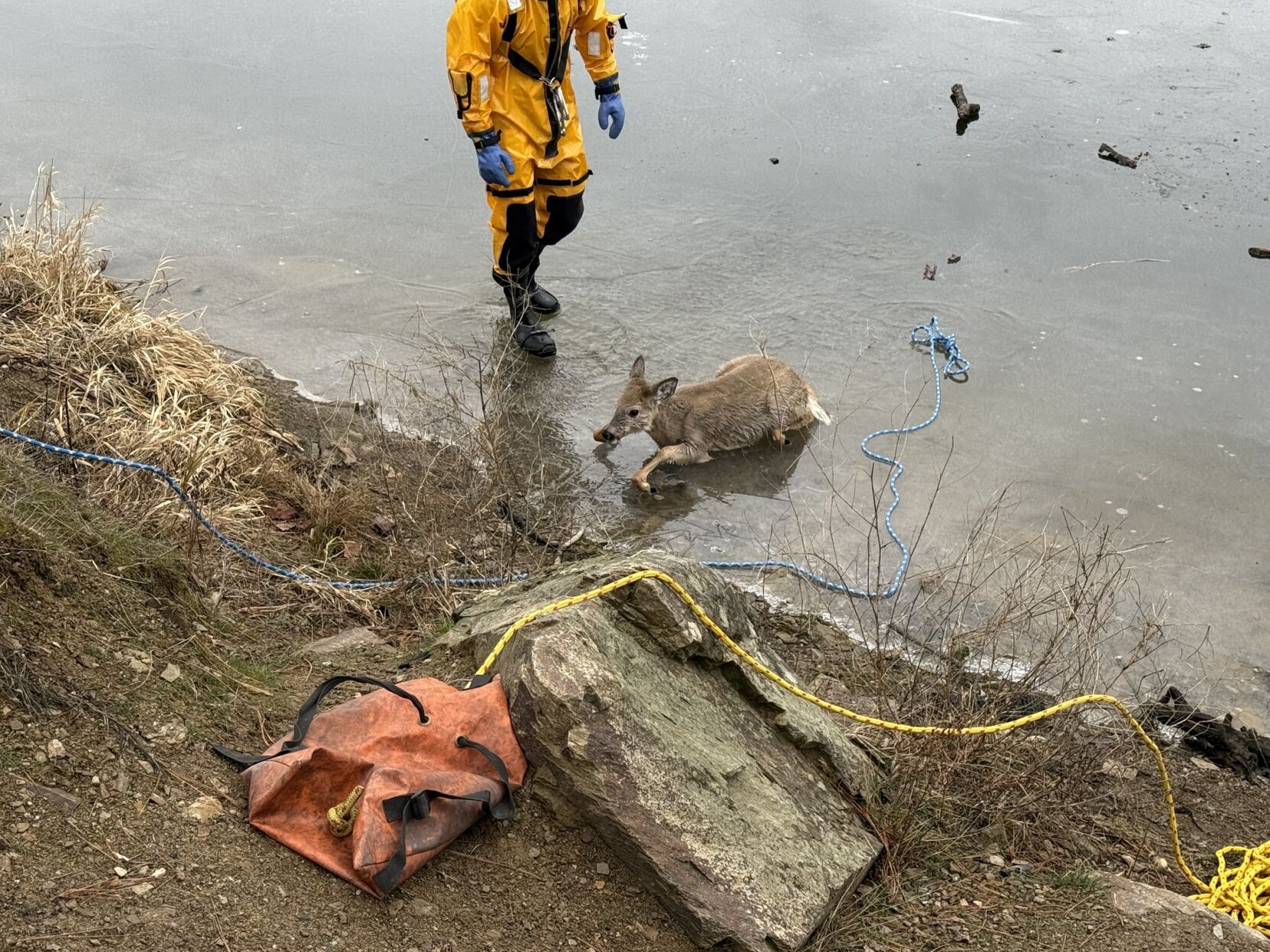 Firefighters were able to safely free the deer and guide it back to shore. The deer ran off unharmed.