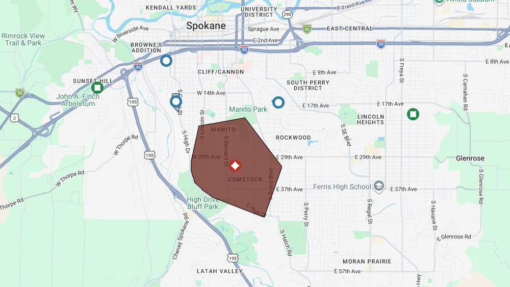 Avista’s outage map shows 1,336 customers without power in the Manito and Comstock neighborhoods on the South Hill. Utility crews have no time of restoration.