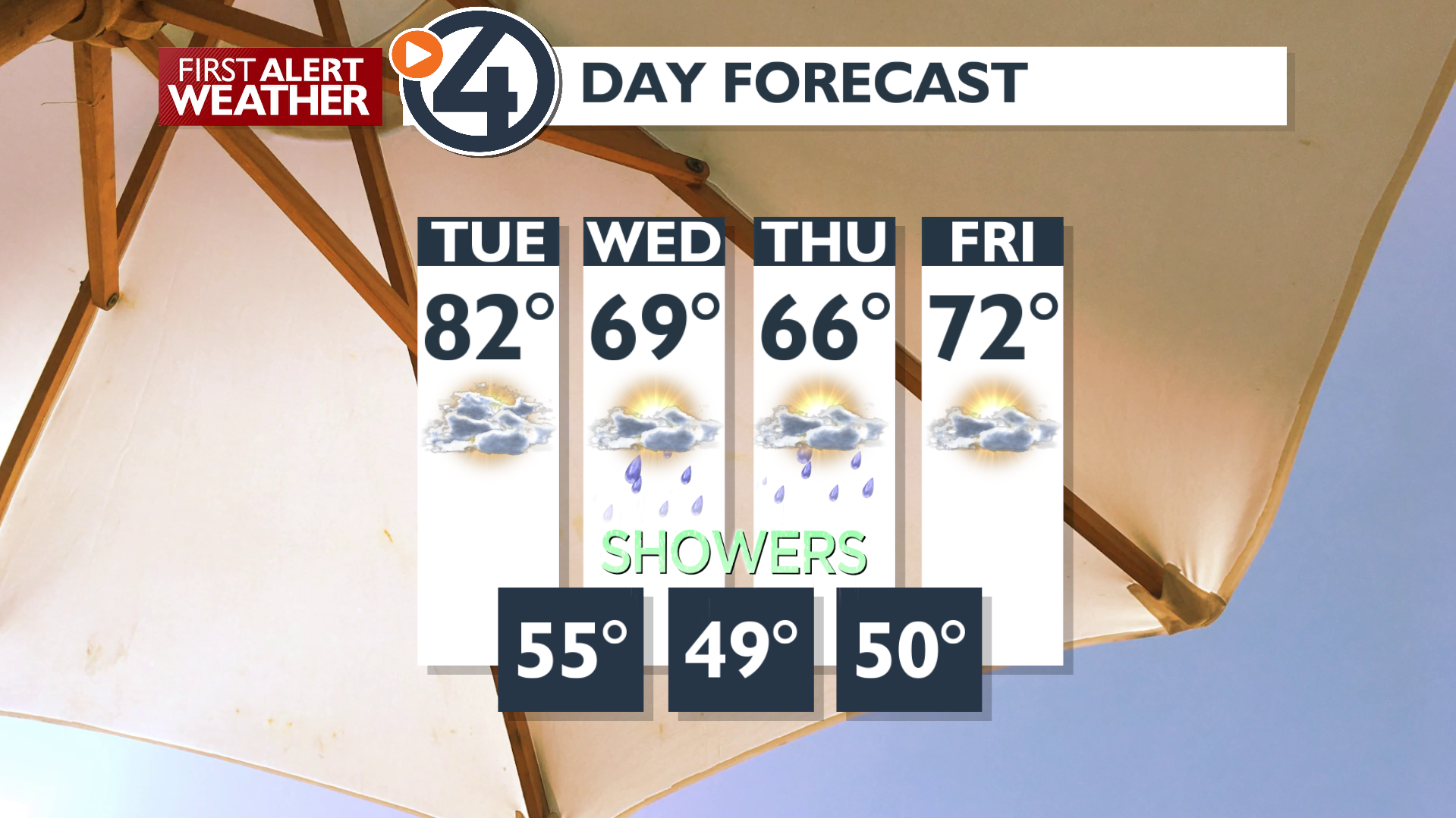 Increased clouds and warm today with low 80s. Cooldown into the 60s for Wednesday and Thursday with chance of showers. What We're Tracking Cooler today with less windTonight and through Thursday we se...