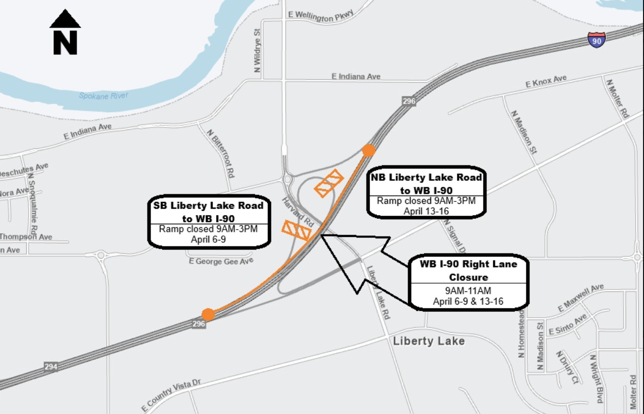 Ramp and lane closures on I-90 in Liberty Lake starting Monday