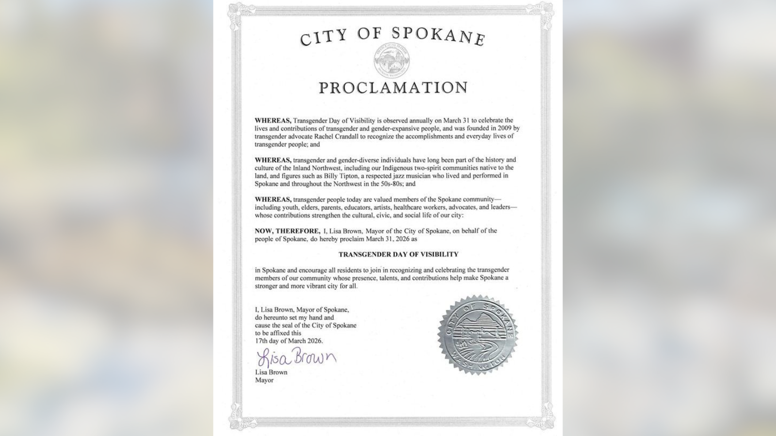 SPOKANE, Wash. - Mayor Lisa Brown has proclaimed March 31 as Transgender Day of Visibility in Spokane, honoring the contributions and lives of transgender and gender-expansive people. The observance, ...