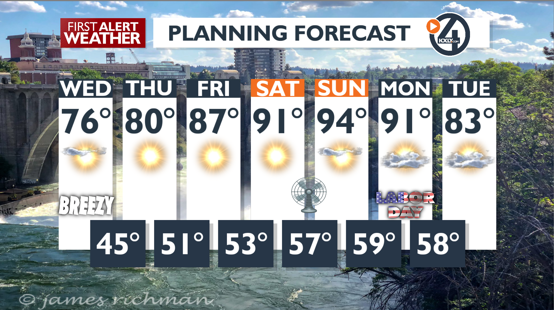 This week we are gradually warming up and will see temperatures in the 90s just in time for Labor Day Weekend festivities. Today, we have temperatures in the low 70s and breezy conditions. Light layer...