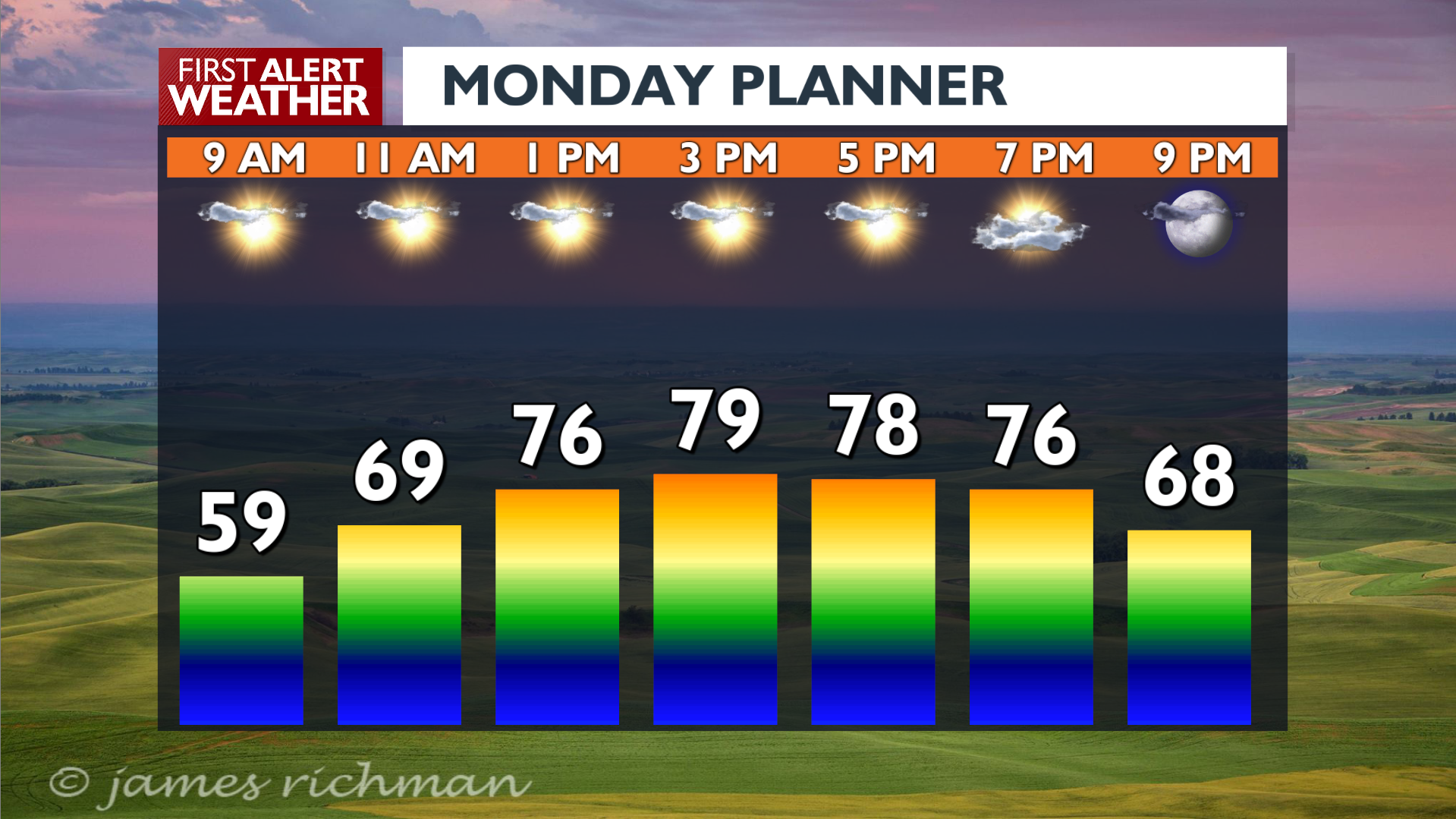 Sunny skies and temperatures in the upper 70s and 80s Monday