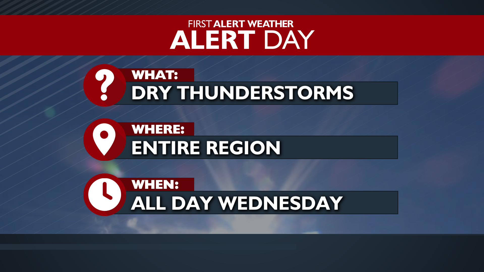 HEAT ADVISORY through Thursday with temps reaching near or at 100. A Weather Alert Day Wednesday due to dry lightning potential which could cause fires. What we're Tracking Hot again todayLight windsP...